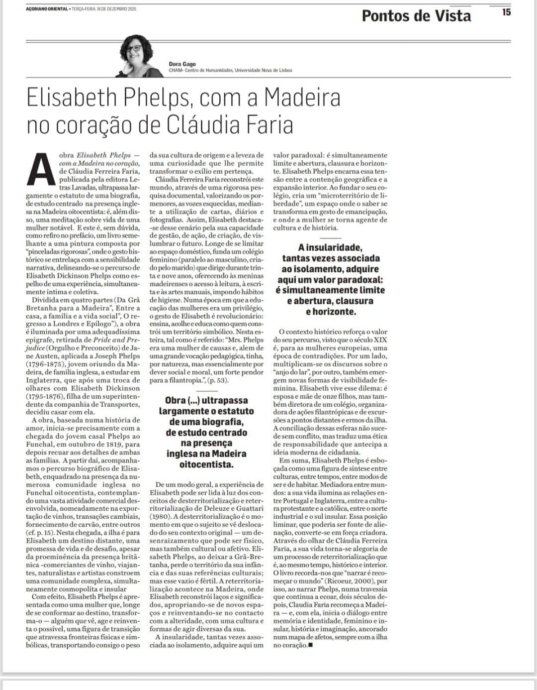 Elisabeth Phelps com a Madeira no Coração, de Cláudia Ferreira Faria- texto publicado no Açoriano Oriental
